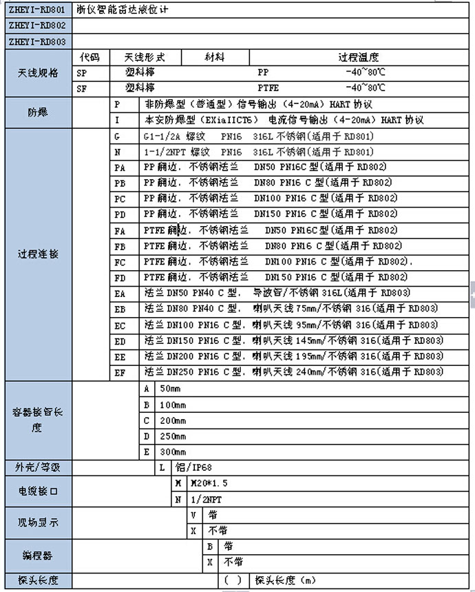 過程連接 RD-801 (PP,PTFE天線) :G1-1/2 316L不銹鋼,: