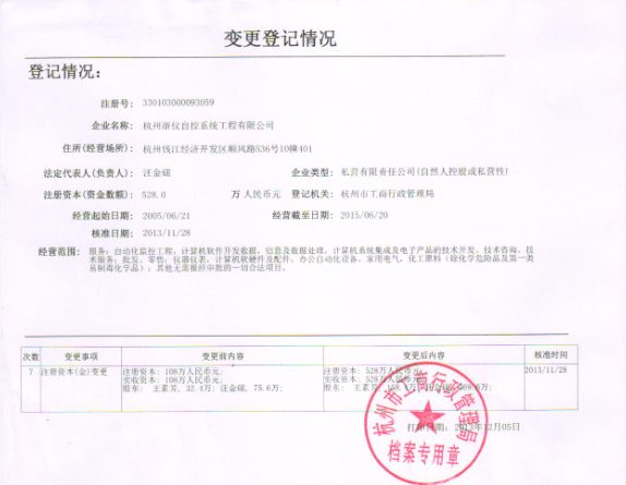 杭州浙儀自控系統(tǒng)工程有限公司自2005年成立至今,已發(fā)展成為專業(yè)化生產(chǎn)各類儀器儀表的制造型廠家,現(xiàn)公司為了擴(kuò)大經(jīng)營規(guī)模、拓寬業(yè)務(wù),更好的服務(wù)客戶,公司經(jīng)開會討論決定增加注冊資金,于2013年12月完成了增資,由原本注冊資金108萬增加至528萬。 飲水思源,公司的成長離不開客戶的支持與信任,我們承諾,今后將以我們更加飽滿的精神和更加周到的服務(wù),在今后的工作合作中竭誠為您服務(wù)。